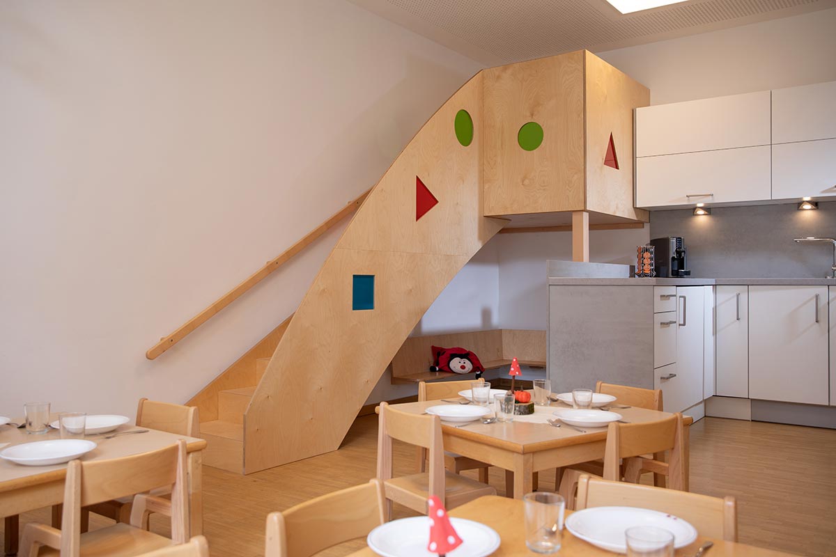 Unsere Krippenkinder essen in den jeweiligen Gruppenräumen. Für die Kindergartenkinder findet das gemeinsame Essen im Kinderrestaurant statt.