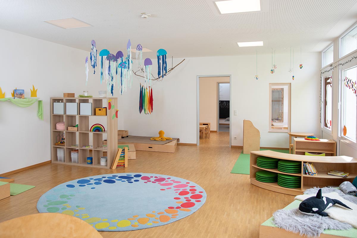 Die Kinder wählen selbstbestimmt auf der jeweiligen Etage, wo, womit und mit wem sie spielen möchten.